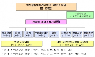어촌뉴딜 300사업 자문단은 권역별 총괄 조정가와 내·외부 전문가 등 총 135명으로 구성되며, 사업 간 균형과 책임감 있는 사업관리를 위해 8대 권역으로 구분해 운영된다.