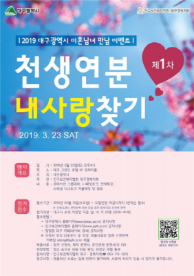 [충청뉴스큐] 대구시 소재 직장인 미혼남녀를 대상으로 미혼남녀 만남이벤트 ‘천생연분 내 사랑 찾기’ 참가자를 선착순 모집한다.