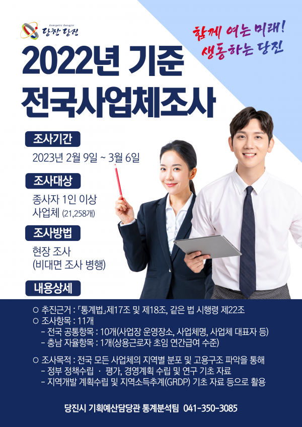 [충청뉴스큐] 당진시가 2월 9일부터 3월 6일까지 당진시 관내 산업활동을 수행하고 있는 사업체 21,258개에 대해‘전국사업체조사’를 실시한다.
