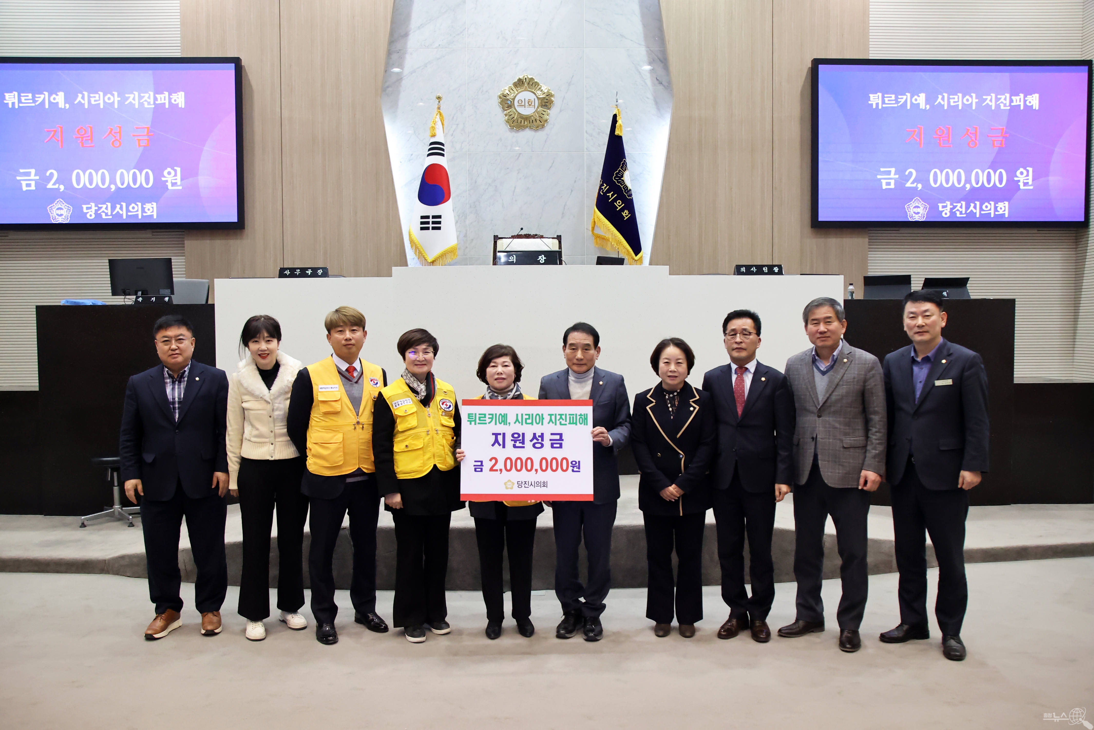 당진시의회(의장 김덕주) 의원들과 직원들이 튀르키예 이재민을 돕기 위해 성금 200만원을 지난21일 본회의장에서 대한적십자사 당진지사(회장 홍승란)에 전달했다“고 밝혔다.