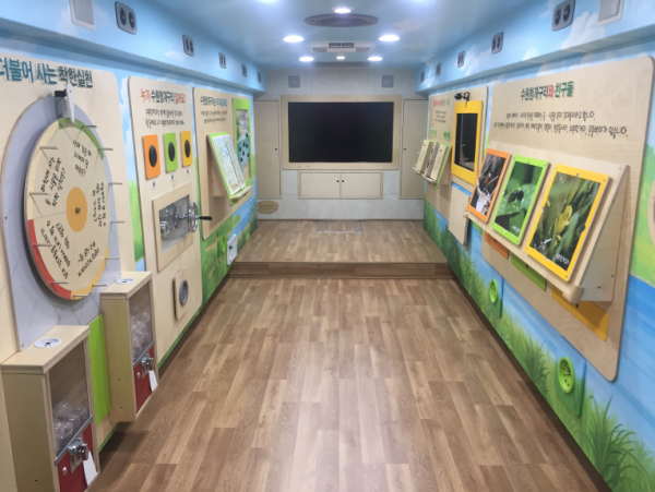 버스 안에서 수원청개구리를 중심으로 수원의 다양한 자연환경 콘텐츠를 체험하고 교실에서는 ‘수원이 환경이야기’를 교재로 삼아 게임 형식으로 올바른 분리배출 방법을 배운다.
