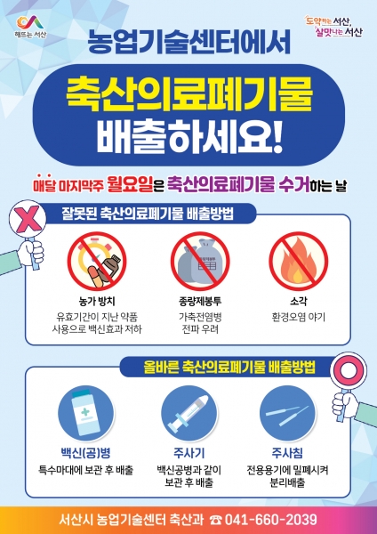 축산농가는 사용한 백신의 공병과 동물용 주사기는 특수마대에 보관·분리하고 주사침은 소독 후 별도의 통에 보관해 농업기술센터에 서산시 방문·배출하면 된다.