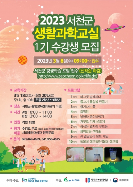 [충청뉴스큐] 서천군이 18일부터 시작하는 2023년 1기 생활과학교실 참가자를 모집한다.