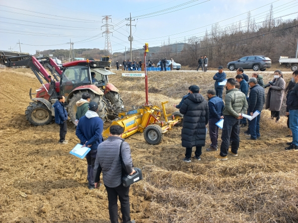 이날 연시회는 사기소동 조민희 농가 포장에서 직파협의회 회원과 농업인 등 50여명이 참여한 가운데 ㈜G-금강에서 개발한 레이저 균평기를 이용해 균평 작업을 선보였다.