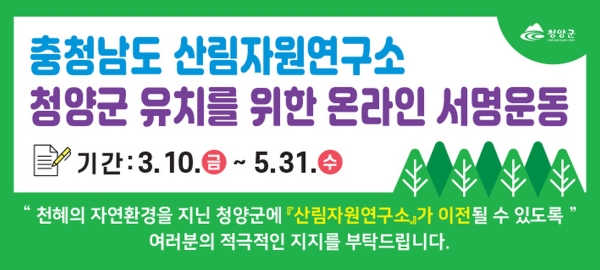 [충청뉴스큐] 충청남도 산림자원연구소 유치에 집중하고 있는 청양군이 군민들의 관심도와 의지를 결집하기 위한 서명운동을 시작한다고 10일 밝혔다.