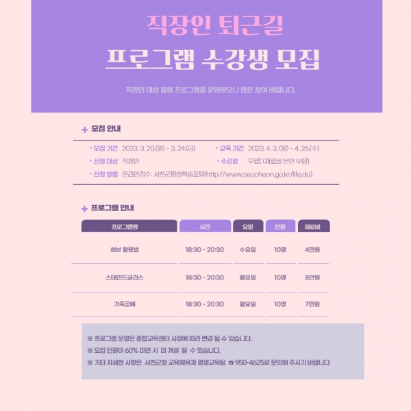 군민이라면 누구나 서천군 평생학습포털 홈페이지에서 신청할 수 있으며 모집 인원이 60% 미만 시 개설되지 않을 수 있다.