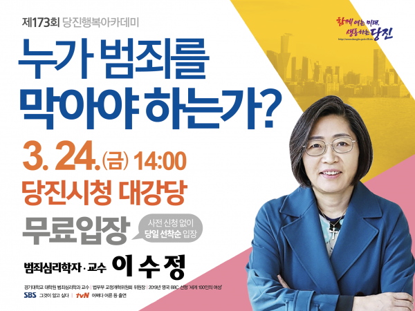 [충청뉴스큐] 당진시가 24일 오후 2시 당진시청 대강당에서 범죄심리학자 이수정 교수를 초청해 제173회 행복 아카데미를 개최한다.