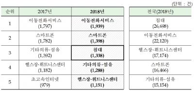 2018년 부산시 상담 접수 상위 5개 품목은 ‘이동전화서비스’, ‘스마트폰’, ‘침대’, ‘기타의류·섬유’, ‘헬스장·피트니스센터’ 순이었다.