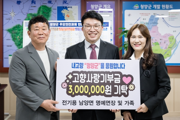 [충청뉴스큐] 청양군은 전기용 남양면 명예면장 및 가족이 청양군을 방문해 고향사랑기부금 3백만원을 기탁했다고 23일 밝혔다.