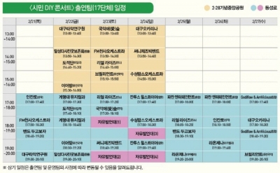 지난 1월 28일부터 2월 1일까지 5일간 대구문화재단 주관으로 진행된 시민공모에는 총 56건이 접수되어 ‘공연문화도시 대구’의 시민 열정과 저력을 여실히 느낄 수 있었으며, 음악, 전통예술, 연극, 무용 등 다양한 분야에서 최종 선정된 총 17개 팀이 시민주간 기간 동안 무대에 올라 기량을 뽐내고 있다.