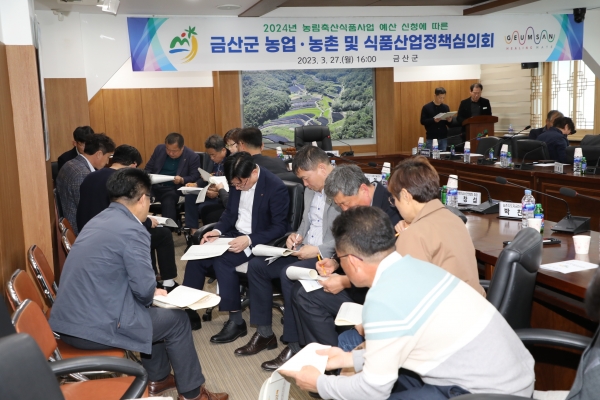 [충청뉴스큐] 금산군은 지난 27일 군청 상황실에서 농업·농촌 및 식품산업정책 심의위원과 관계 공무원 등 총 50여명이 참석한 가운데 2024년 농림사업 예산 신청에 따른 농업⋅농촌 및 식품산업정책심의회를 개최했다.