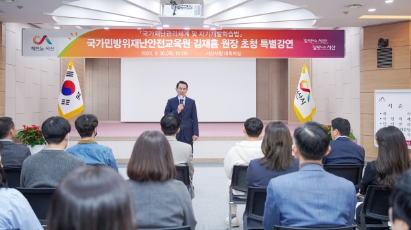 시 공무원을 대상으로는 국가의 재난대응 메커니즘의 이해도를 높이고자 김재흠 국가민방위재난안전교육원장이 ‘국가재난관리체계에 대한 이해’를 주제로 특강을 했다.