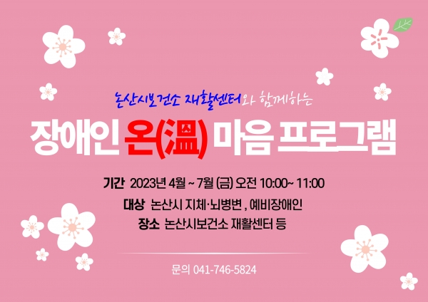 프로그램은 4월부터 오는 6월까지 매주 금요일 오전, 논산시보건소 재활센터에서 진행되며 시민공원 나들이 요리 프로그램 아로마 체험 재활센터 벽화 꾸미기 등의 다채로운 콘텐츠로 꾸며진다.