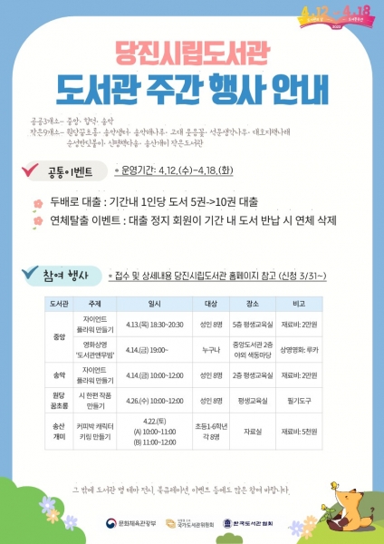 [충청뉴스큐] 당진시립도서관이 매년 4월 12일부터 18일로 지정된 도서관 주간을 맞아 시민들을 위한 다양한 행사를 진행한다.