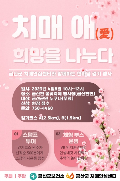 [충청뉴스큐] 금산군보건소는 오는 8일 금산읍에서 열리는 금산천 봄꽃 축제장에서 ‘치매 애희망을 나누다’를 주제로 제4회 한마음 치매극복 걷기행사를 개최한다.