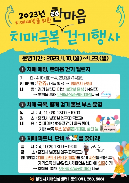또한 11일 오후 5시부터 2시간 동안 당진천 벚꽃길 입구에서 치매 극복 함께 걷기 홍보부스를 운영해 치매 극복을 위한 함께 걷기 릴레이 캠페인 치매안심센터 사업 홍보 치매예방에 대한 정보와 중요성 홍보 치매예방수칙 3.3.3 및 치매예방운동법 안내 등 다양한 프로그램을 진행할 예정이다.