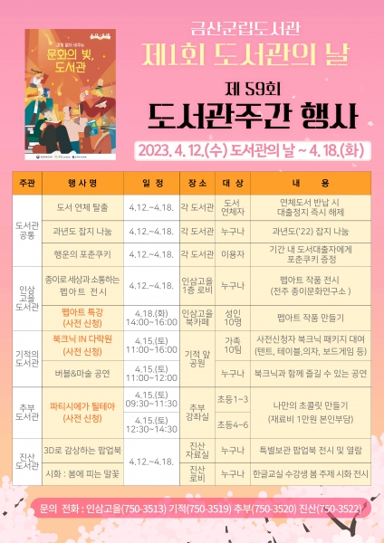 [충청뉴스큐] 금산군은 제59회 도서관 주간을 맞아 오는 12부터 18일까지 인삼고을·기적·추부·진산 도서관에서 이벤트, 전시, 체험 등 행사를 마련한다.