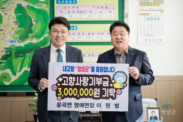 [충청뉴스큐] 청양군은 지난 8일 이원범 운곡면 명예면장이 운곡면사무소를 방문해 고향사랑기부금 3백만원을 기탁했다고 밝혔다.