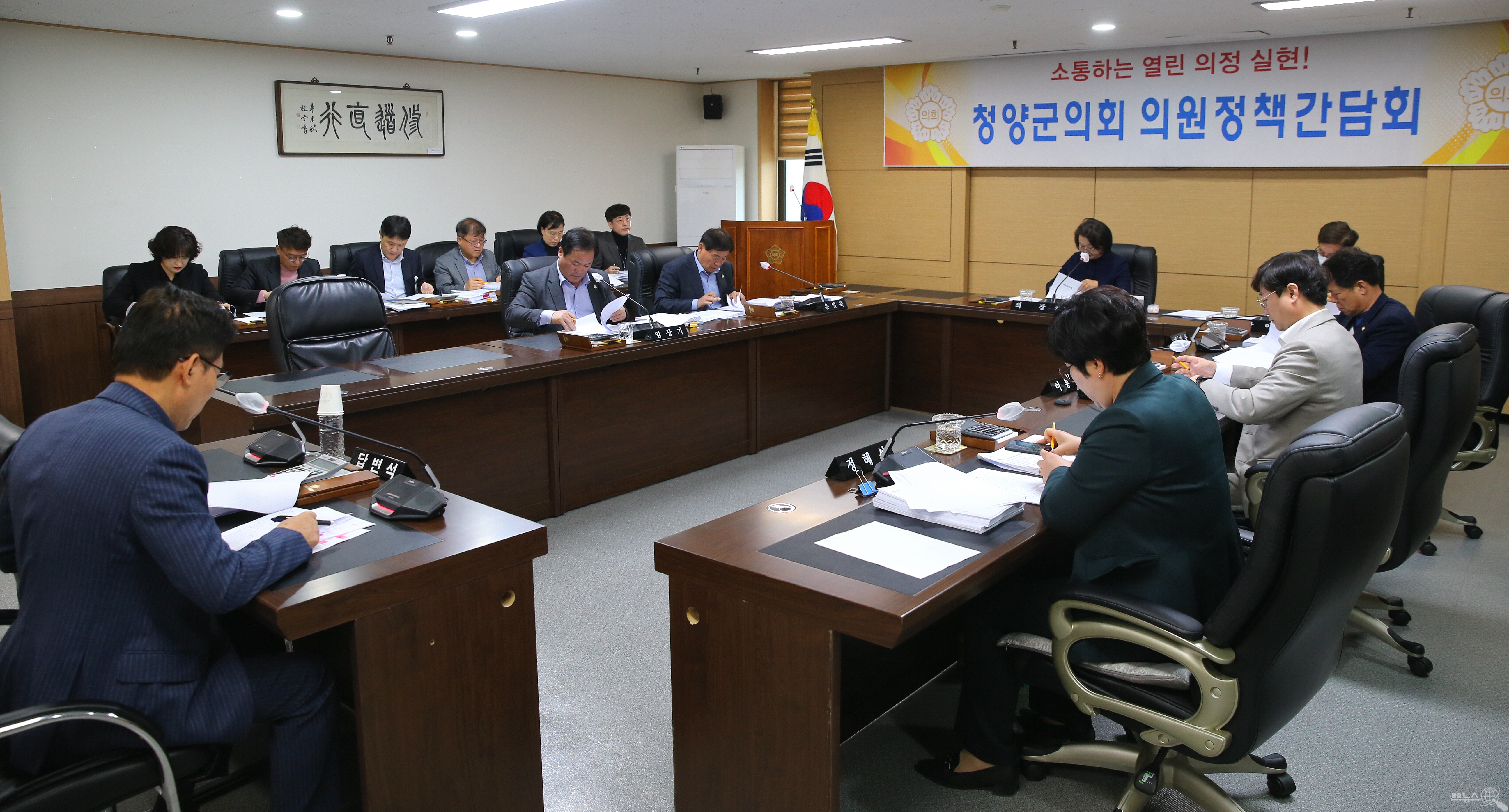 청양군의회(의장 차미숙)는 지난11일 특별위원회 회의실에서 의원 및 담당 부서장이 참석한 가운데 의원정책간담회를 개최했다“고 밝혔다.