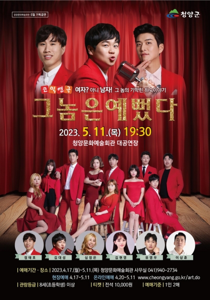[충청뉴스큐] 오는 5월 11일 오후 7시 30분 청양문예회관에서 코믹연극 ‘그놈은 예뻤다’를 무대에 올리는 청양군이 17일부터 공연 당일까지 관람권을 예매한다고 14일 밝혔다.