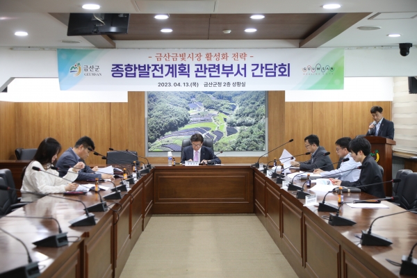 [충청뉴스큐] 금산군은 지난 13일 금산군청 상황실에서 금산금빛시장의 발전 방향을 논의하기 위해 박범인 금산군수를 비롯해 경제산업국장, 경제과장 등 8명이 참석한 가운데 간담회를 개최했다이 자리에서 지역 특화상품 사업화 관광자원화, 시설현대화 경영혁신 자생력 강화 등 3대 중점과제 10개 추진사업을 설정해 발전 방향을 공유하고 사업별 각 부서의 역할을 의논했다.