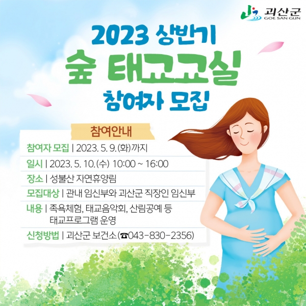 [충청뉴스큐] 충북 괴산군은 성불산 자연휴양림에서 괴산군에 거주하는 임신부 및 관내 직장인 임신부를 대상으로 ‘숲 태교 교실’을 운영한다고 밝혔다.