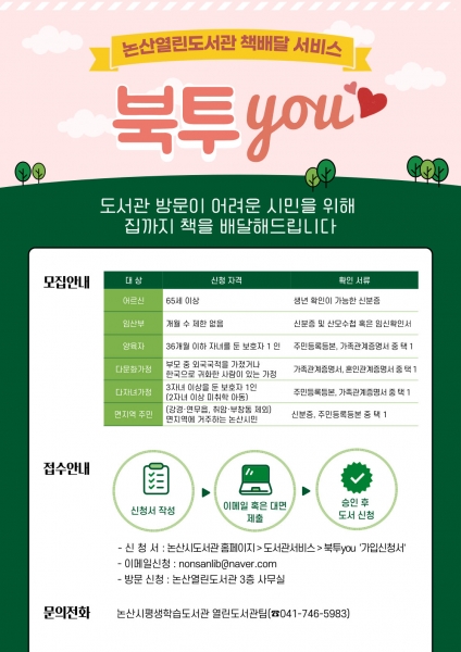 서비스 이용 희망자는 논산시 도서관 회원가입 후 대상별 구비서류를 논산 열린도서관으로 제출하면 된다.