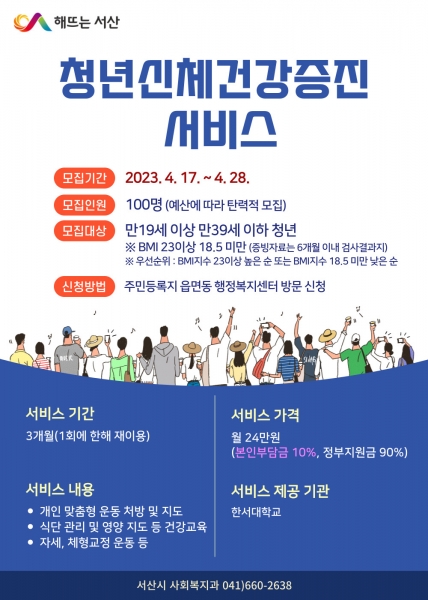 [충청뉴스큐] 충남 서산시는 한서대 청년사회서비스 사업단을 통해 5월 8일까지 청년신체건강증진서비스를 이용할 청년들을 모집한다고 밝혔다.
