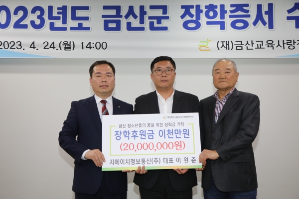 이날 장학증서 수여식에 앞서 지에이치정보통신에서 금산군 청소년들의 꿈을 응원하기 위한 장학금 2000만원을 기탁하는 뜻깊은 행사가 진행됐다.