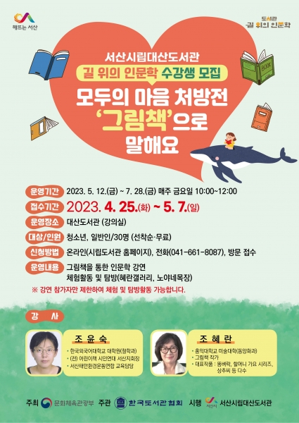 [충청뉴스큐] 충남 서산시는 서산시립대산도서관에서 그림책을 이용한 자기성찰 인문학 강좌인 ‘모두의 마음 처방전 그림책으로 말해요’의 수강생을 5월 7일까지 선착순으로 30명 모집한다고 밝혔다.