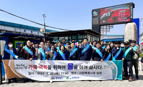 [충청뉴스큐] 서천군이 27일 서천특화시장 일원에서 가뭄 극복을 위한 생활 속 물 절약을 위한 대대적인 절수 홍보를 위해 민관 합동 캠페인에 나섰다.