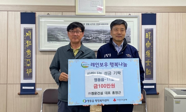 이날 홍영근 대표는 영동읍에서 추진중인 2023 사랑나눔 행복나눔 릴레이 나눔 캠페인의 제11호 기부천사가 되며 지역의 나눔문화 조성에 힘을 보탤 것을 약속했다.