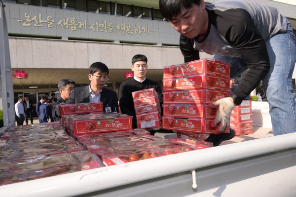 27일 시청사를 찾은 기업인들은 논산에서 생산된 신선 방울토마토들을 열심히 실어 나르며 한목소리로 지역 농가에 보탬이 되길 바란다는 뜻을 전했다.