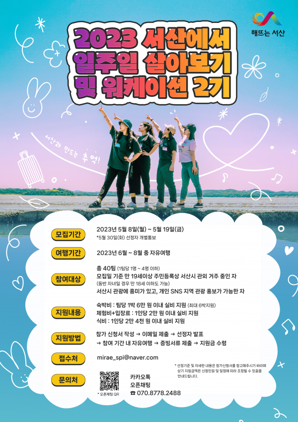 [충청뉴스큐] 충남 서산시가 지난 제1기 ‘2023년 서산에서 일주일 살아보기 및 워케이션’의 호응에 이어 8일부터 19일까지 제2기 참가팀을 모집한다고 밝혔다.