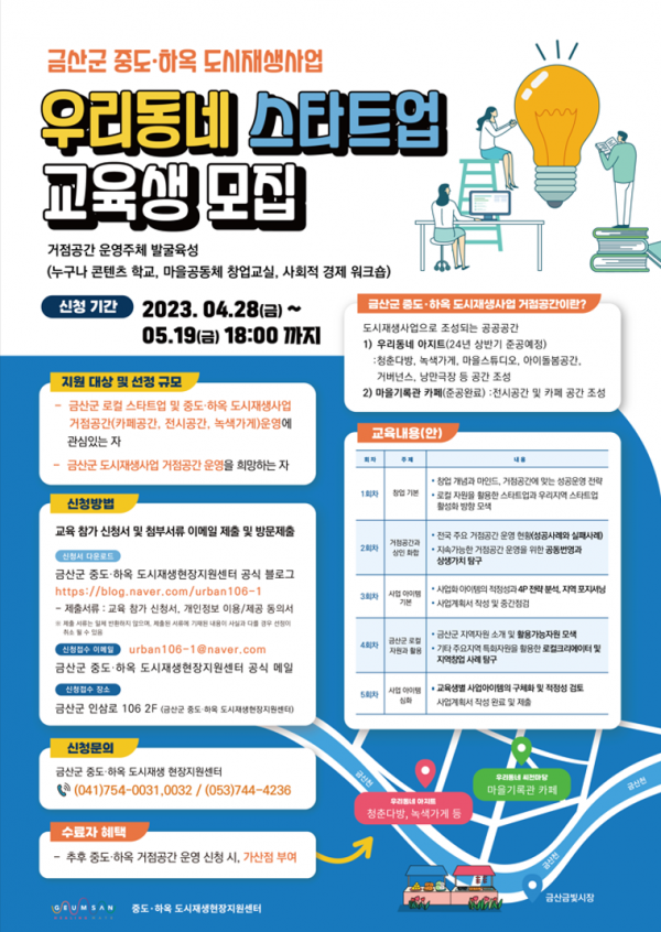 우리동네 스타트업 교육생 모집에 관한 자세한 내용은 금산군 중도·하옥도시재생현장지원센터에 문의하면 된다.