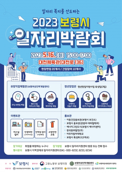 [충청뉴스큐] 보령시는 오는 16일 대천체육관에서 구직자와 기업의 매칭을 통한 맞춤형 고용지원을 위해 일자리 박람회를 개최한다.