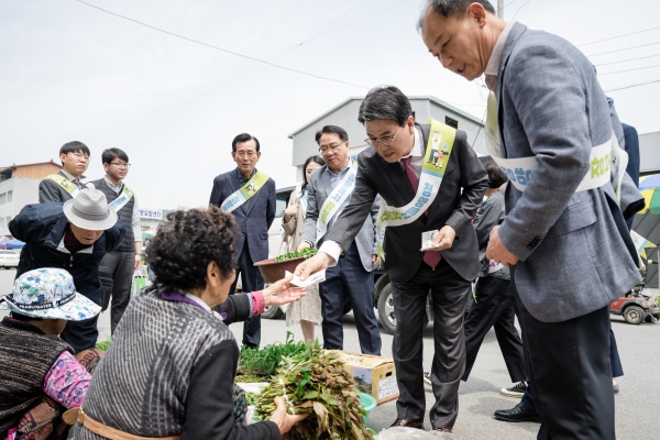 김 군수와 참여자들은 ‘청양에서 장 보자’라는 어깨띠를 착용하고 시장 곳곳에서 청양사랑상품권으로 지역 물품을 구매하면서 주민 동참을 당부했다.