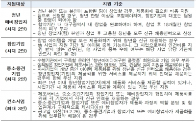 모집대상은 아이디어의 사업화 및 제품화 계획을 가진 대구지역 소재 예비창업자나 창업기업, 중소기업으로서 청년 창업 및 채용 계획이 있으면 누구나 신청이 가능하다.