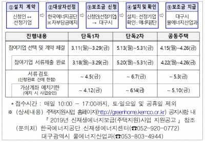 [충청뉴스큐] 대구시는 정부의 ‘2019년도 신재생에너지 주택 지원 사업’에 따라 친환경에너지 보급 확대와 설치자의 자부담 경감을 위해 대구시에 소재한 단독주택 및 공동주택을 대상으로 정부 보조금에 더해 설치비의 일부를 추가 지원한다.