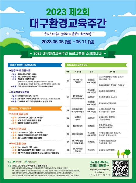 ‘제2회 대구환경교육주간’은 기후위기 등 환경 문제에 대해 이해하고 시민의 일상 속 친환경 생활 실천 참여 확산을 위해 환경의 날을 시작으로 11일까지 7일간 운영한다.