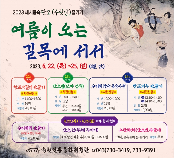 [충청뉴스큐] 충북 옥천전통문화체험관에서는 많은 관람객이 단오 세시풍속을 즐길 수 있도록 올해 단오 체험행사를 단오 당일인 22일부터 25일 주말까지 진행한다.