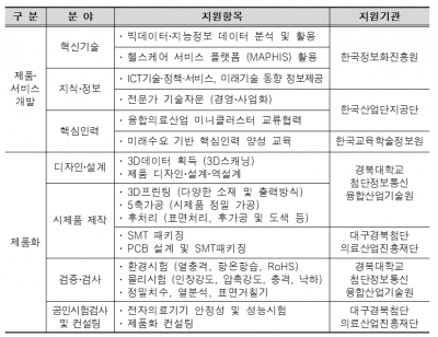 주요 지원내용으로 빅데이터·지능정보 데이터 및 헬스케어 서비스 플랫폼 활용 지원, 기술정보 제공 전문가 기술자문 및 협력 네트워크 지원 시제품 제작 지원 공인 시험검사지원 등이 있으며, 기업 당 최대 5천만원을 바우처로 지급해 기업이 원하는 프로그램을 자유롭게 이용할 수 있도록 했다.