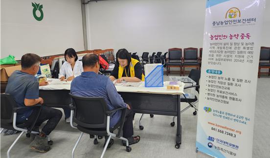 이번 검사는 단국대병원 충남농업안전보건센터와의 협업으로 실시됐으며 전문의의 지도 속에 작업환경에 맞는 맞춤형 상담 농약 노출 검사 설문 신체 상태·채혈·혈압·소변검사 등이 진행됐다.