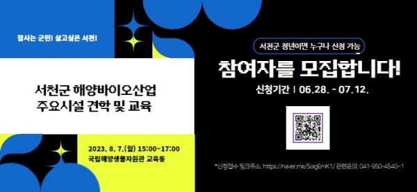 [충청뉴스큐] 서천군이 지역 청년들을 대상으로 해양바이오산업에 대한 인식 확산과 공감대 형성을 위해 교육 기회를 마련, 다음달 12일까지 참여자를 모집한다.