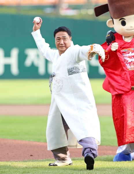 경기장에서는 정영철 군수가 영동군의 마스코트인 '우리'와 와인캐릭터탈과 함께 시구자로 나서 경기 시작을 알렸다.