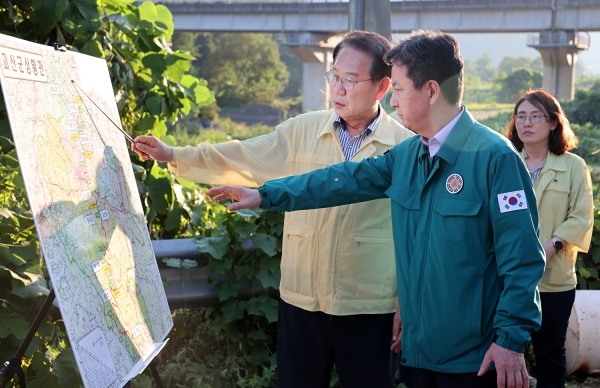지난 19일 괴산지역을 방문한 한창섭 행정안전부 1차관은 폭우로 교량이 유실된 청천면 덕평리 운교 교량을 둘러봤다.