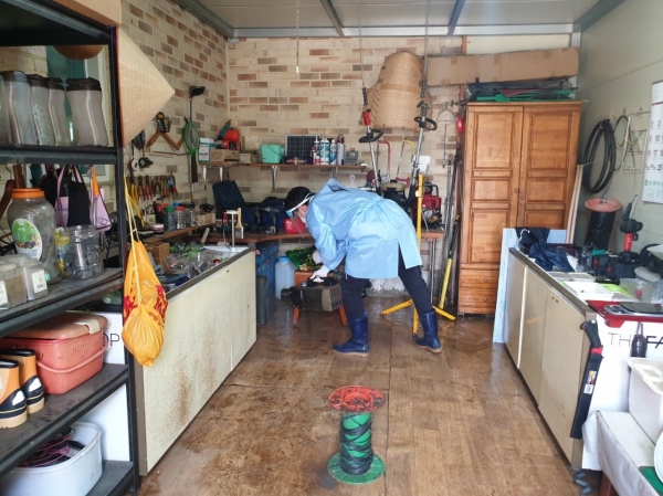 1차 복구가 진행된 침수 피해가정 250여 가구에는 2인 1조, 9개반를 별도 편성해 가가호호 찾아가는 가정방역을 실시한다.