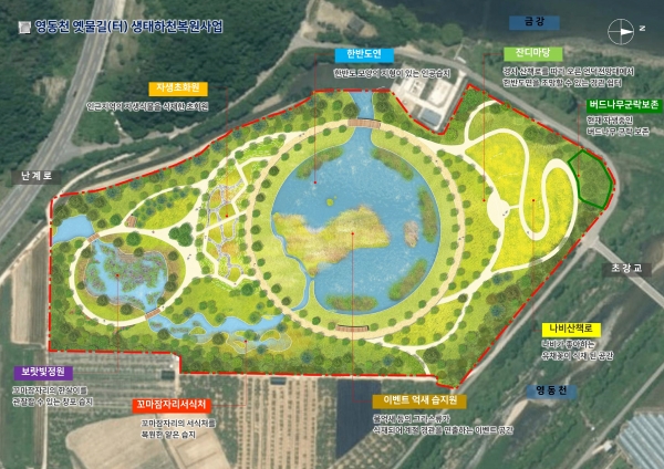 군은 상징성을 지닌 영동천의 옛 물길 복원에 90억원을 투입해 심천면 초강리 일원 80,000㎡에 생태습지 생태탐방로 관찰데크 학습장 등을 조성하는 사업으로 토지보상협의 절차를 거쳐 2025년 말까지 마무리할 계획이었다.