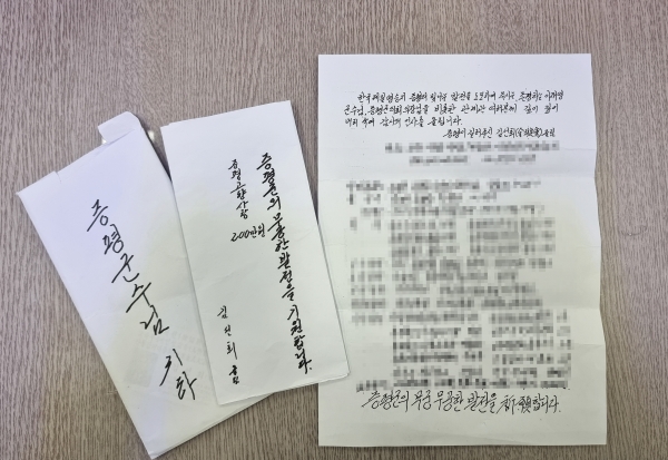 봉투에는 고향사랑기부금 200만원과 손수 쓴 편지 한 장이 담겨있었다.