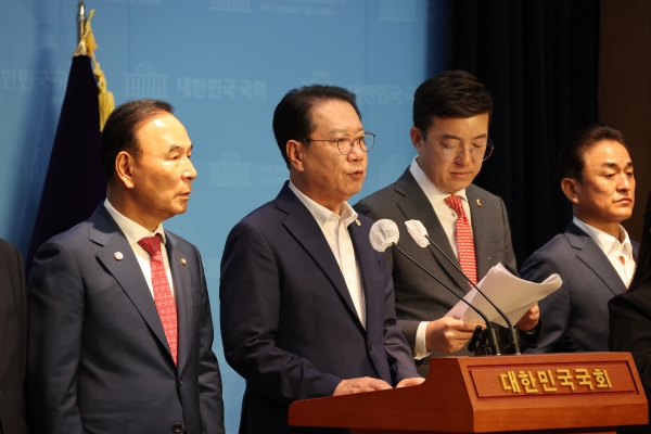 지난 31일 국회소통관에서 열린 기자회견에 송인헌 군수, 박덕흠 국회의원, 신송규 괴산군의회 의장, 이태훈 충북도의원이 참석해 괴산댐 다목적댐 전환 관련 기자회견문을 발표했다.